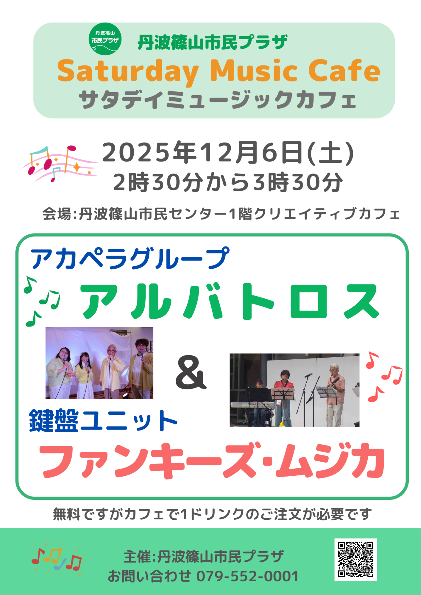 丹波篠山市民プラザ 12月6日のサタデイミュージックカフェのご案内です